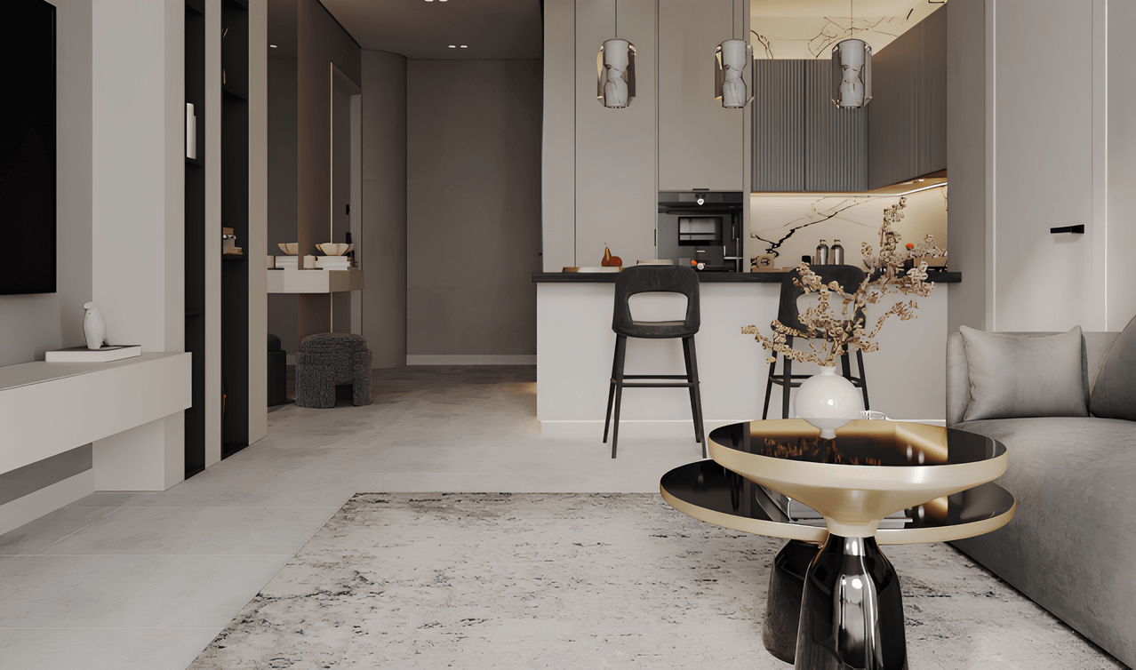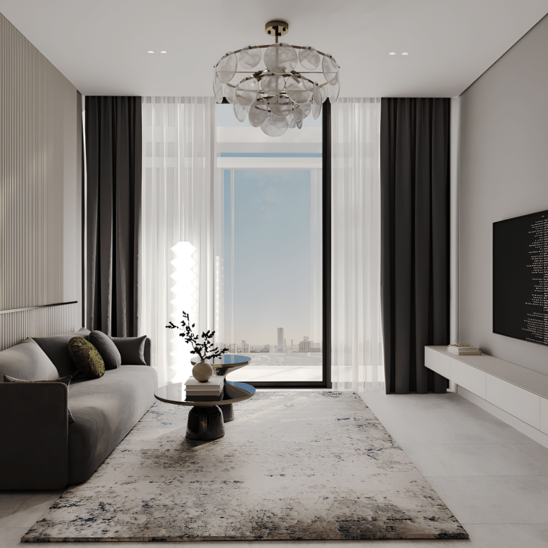 The F1FTH Tower is the fifth project from developer Object One Real Estate Development. This is the elegant 36-storey tower, which is designed in a contemporary style with sleek lines and open balconies with glass enclosures. The project is located in the lively and developed area of Jumeirah Village Circle. Luxury studios and 1, 2 bedroom apartments with spacious and functional layouts are available for sale. The interiors are designed in a modern style using light gray tones, which creates a strict and cozy atmosphere. The windows offer stunning views of the city scenery.